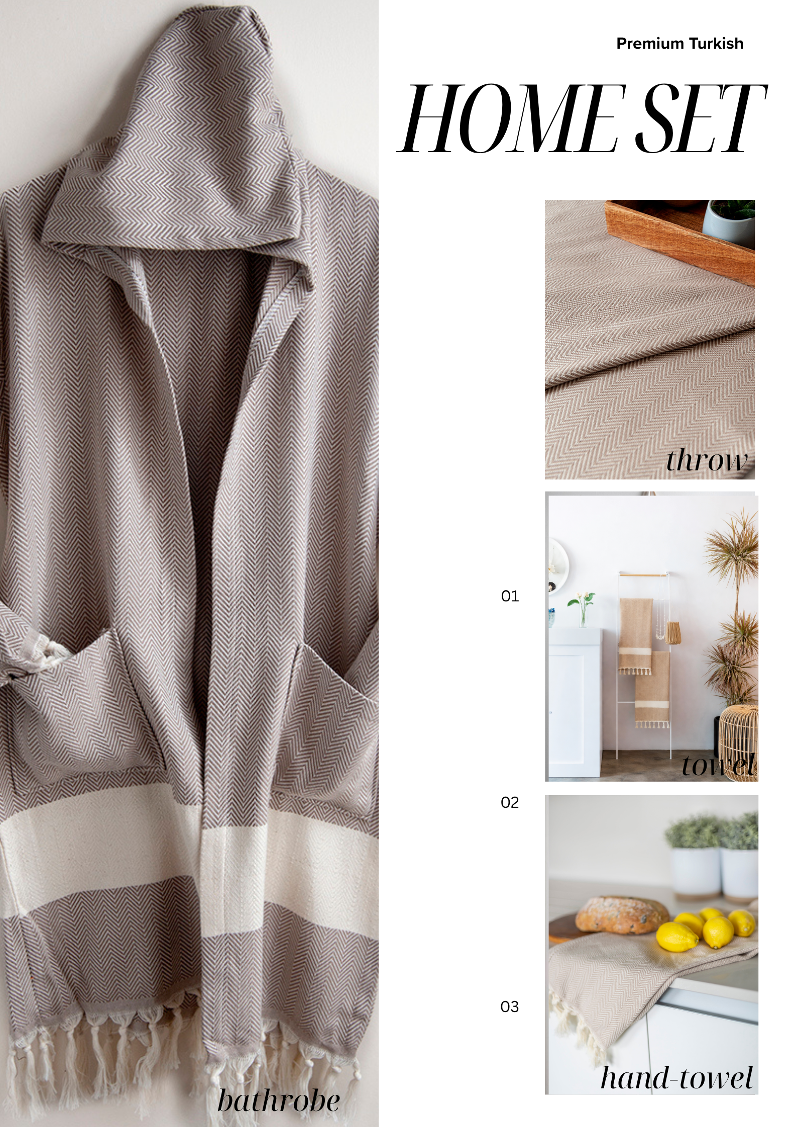 The set includes a bathrobe, XL throw, towel, and hand towel, offering versatility across your home. The bathrobe provides a relaxed, spa-like feel for slow mornings or evenings, while the throw adds warmth and texture to your living space. The towel and hand towel complete the set with functionality, designed for both performance and aesthetic appeal.