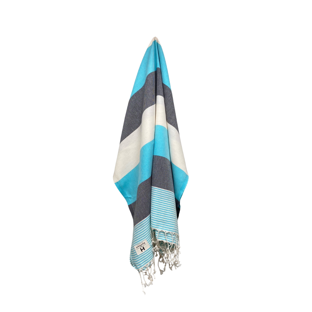Available in more than 5 vibrant colour combinations, our RTurquoise Grey Balat Turkish towels are lightweight bath sheets.